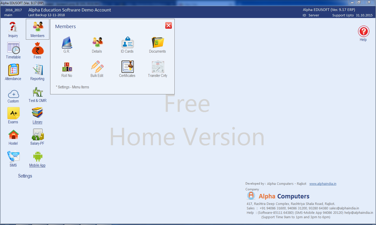 All the features like Student & Staff data management, Staff I-Card, Student I-Card, Inquiry management, Attendance, Auto Attendance, Test Management, Test Monthly reports, Fees Management, Fees collection and Pending Reports, SMS Facilities, Various Certificates, Complete result systems and many more are part of it.